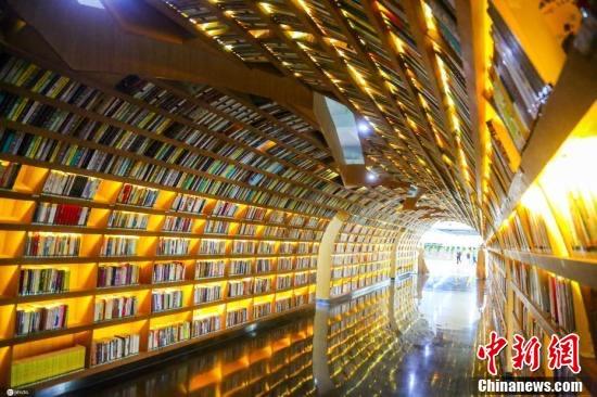 資料圖:河南省鄭州市,一所高校在圖書館內(nèi)打造了一條近百米長(zhǎng)的“書海隧道”。