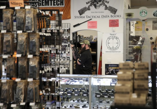 2017年10月4日,在美國(guó)拉斯維加斯的“新前線”槍械商店,一名店員為顧客展示槍支。“新前線”是當(dāng)?shù)匾?guī)模較大的一家槍械商店,售賣槍支彈藥、槍周邊用品、槍文化衍生品等。新華社記者王迎攝