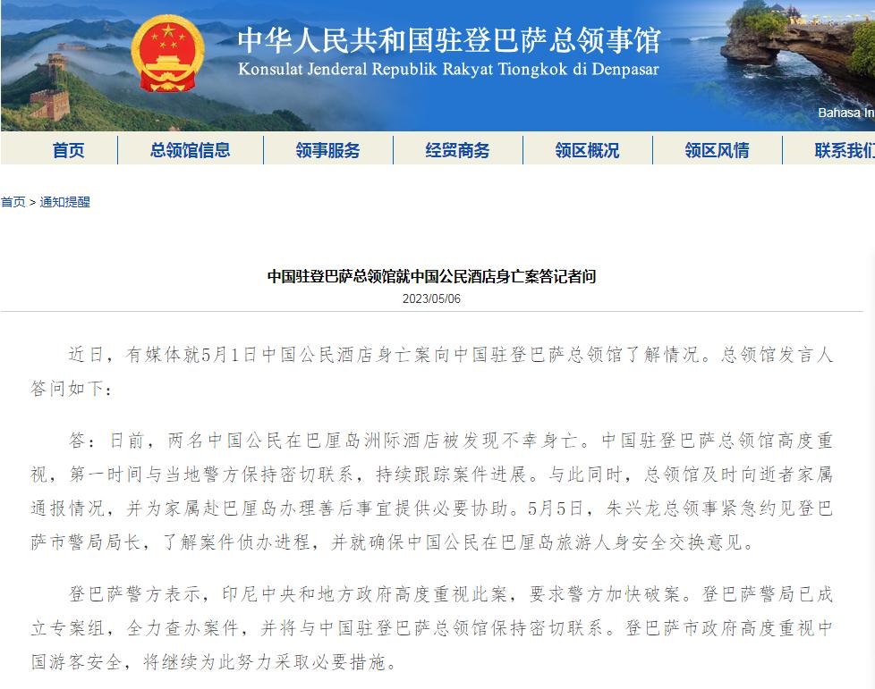 答:日前,兩名中國公民在巴厘島洲際酒店被發(fā)現(xiàn)不幸身亡。中國駐登巴薩總領(lǐng)館高度重視,第一時間與當?shù)鼐奖3置芮新?lián)系,持續(xù)跟蹤案件進展。與此同時,總領(lǐng)館及時向逝者家屬通報情況,并為家屬赴巴厘島辦理善后事宜提供必要協(xié)助。5月5日,朱興龍總領(lǐng)事緊急約見登巴薩市警局局長,了解案件偵辦進程,并就確保中國公民在巴厘島旅游人身安全交換意見。