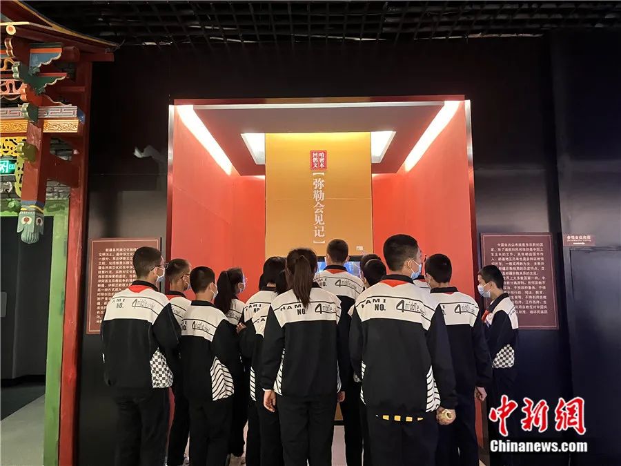 運用現(xiàn)代科技手段展示的彌勒會見記受到學(xué)生的關(guān)注和喜愛。新疆哈密市博物館 供圖