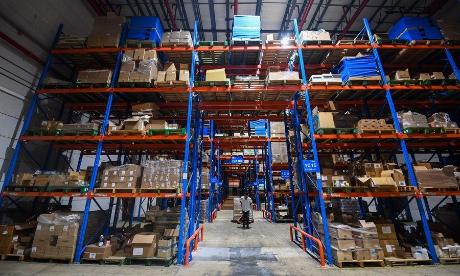 2022年9月2日,在杭州綜合保稅區(qū)一家跨境保稅倉內(nèi),工作人員在搬運跨境電商保稅進口商品。新華社記者 徐昱 攝