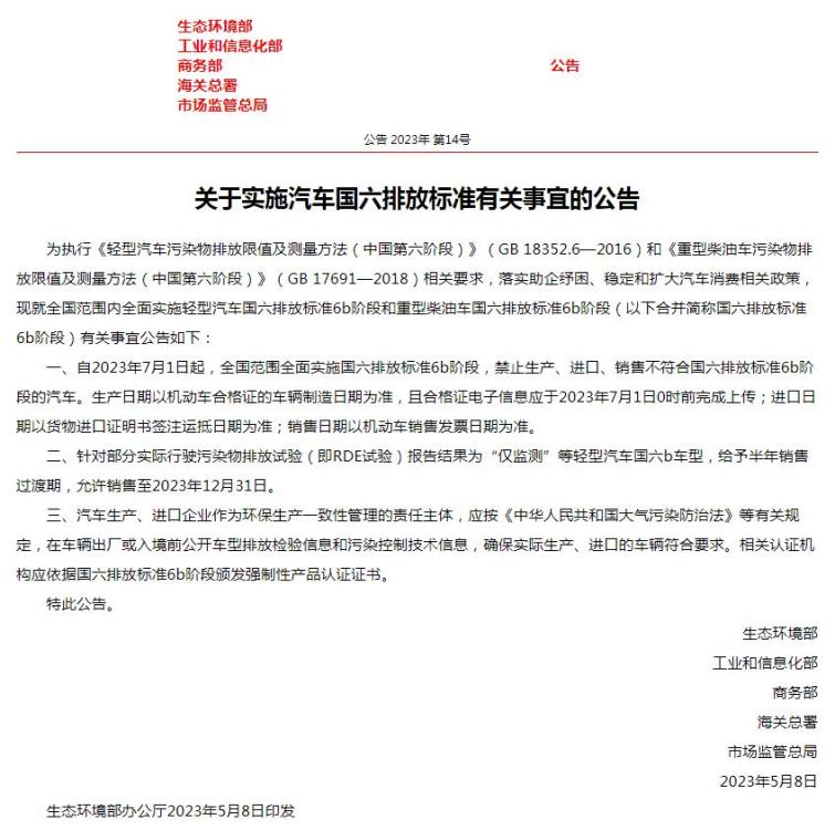 其中要求,自2023年7月1日起,全國范圍全面實施國六排放標(biāo)準(zhǔn)6b階段,禁止生產(chǎn)、進(jìn)口、銷售不符合國六排放標(biāo)準(zhǔn)6b階段的汽車。生產(chǎn)日期以機動車合格證的車輛制造日期為準(zhǔn),且合格證電子信息應(yīng)于2023年7月1日0時前完成上傳;進(jìn)口日期以貨物進(jìn)口證明書簽注運抵日期為準(zhǔn);銷售日期以機動車銷售發(fā)票日期為準(zhǔn)。