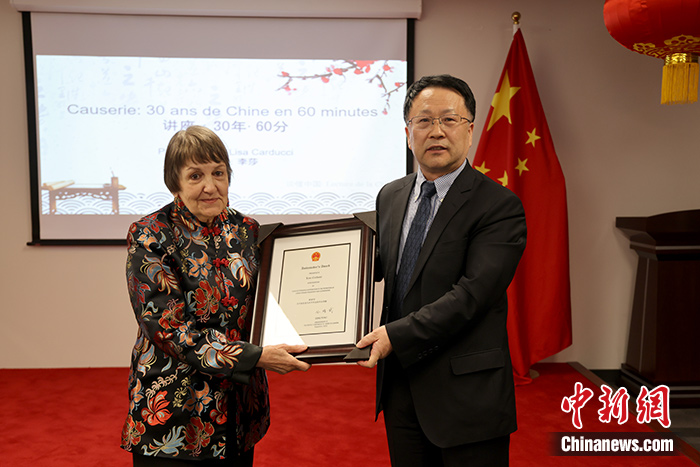 中新社蒙特利爾5月14日電 (記者 余瑞冬)加拿大著名作家、詩人、漢學(xué)家李莎·卡爾杜齊(Lisa Carducci)13日在中國駐蒙特利爾總領(lǐng)事館獲頒中國駐加拿大使館2022年度“大使獎”。