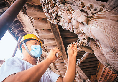 2022年,在國家文物局的指導(dǎo)下,中國文化遺產(chǎn)研究院援助尼泊爾工作隊(duì)經(jīng)過近5年努力,圓滿完成尼泊爾加德滿都杜巴廣場(chǎng)九層神廟建筑群文物本體維修。圖為2022年7月,工人在尼泊爾加德滿都進(jìn)行九層神廟建筑群修復(fù)工作。