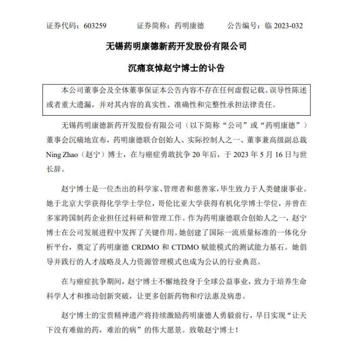 藥明康德發(fā)布的訃告稱,趙寧在與癌癥勇敢抗?fàn)?0年后,于2023年5月16日與世長(zhǎng)辭。