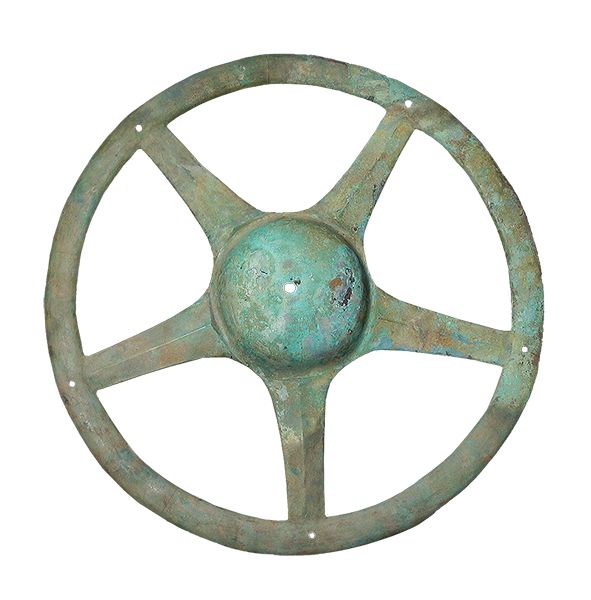 三星堆出土文物中,青銅太陽輪形似如今的“方向盤”,其用途引來了種種猜測:有研究者認(rèn)為這是車輪,還有觀點(diǎn)認(rèn)為是用于軍事作戰(zhàn)的盾牌上的盾飾。多數(shù)意見認(rèn)為,這種形制的器物應(yīng)即是“太陽形器”。它是常設(shè)在古蜀國神廟中的神器,或用于祭祀儀式。