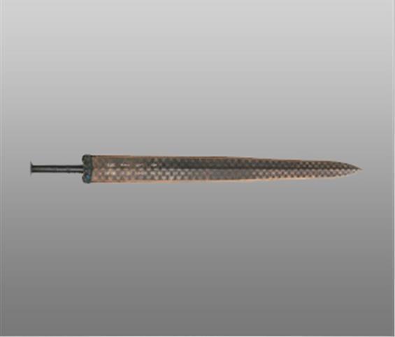 越王勾踐劍天下聞名。劍身中脊起棱,飾黑色菱形花紋。劍格正面嵌藍(lán)色琉璃,背面綠松石。歷經(jīng)兩千余年,紋飾仍然清晰精美、劍身鋒利無比。