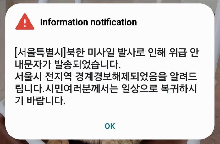 “今天6時(shí)32分首爾地區(qū)發(fā)布警戒警報(bào)。請(qǐng)各位國(guó)民做好躲避準(zhǔn)備,讓兒童和老弱者優(yōu)先躲避。”當(dāng)天清晨,首爾市民收到這條危急災(zāi)害通知,手機(jī)同時(shí)響起警笛聲。