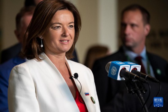 6月6日,在位于紐約的聯(lián)合國總部,斯洛文尼亞外長塔尼婭·法永在斯洛文尼亞當選聯(lián)合國安理會非常任理事國后在記者見面會上講話。新華社發(fā)(聯(lián)合國供圖/洛伊·費利佩攝)