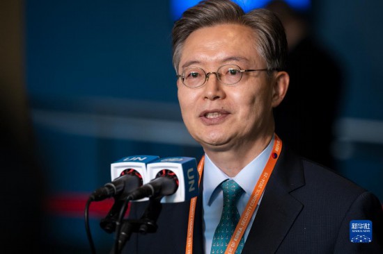 6月6日,在位于紐約的聯(lián)合國總部,韓國常駐聯(lián)合國代表黃浚局在韓國當選聯(lián)合國安理會非常任理事國后在記者見面會上講話。新華社發(fā)(聯(lián)合國供圖/洛伊·費利佩攝)