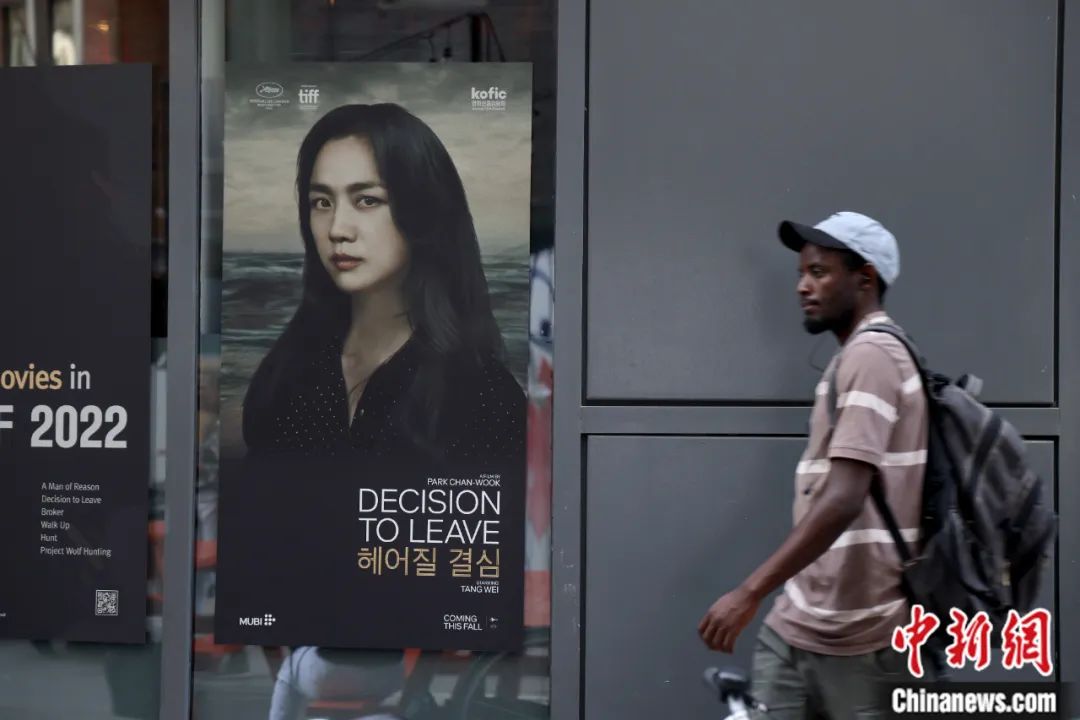 韓國(guó)影片《分手的決心》亮相第47屆多倫多國(guó)際電影節(jié),行人從主演湯唯的海報(bào)前經(jīng)過(guò)。余瑞冬 攝