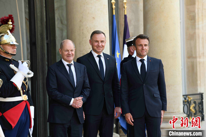 當(dāng)?shù)貢r間6月12日晚,法國總統(tǒng)馬克龍在巴黎愛麗舍宮與德國總理朔爾茨、波蘭總統(tǒng)杜達(dá)會面。他們共同出席“魏瑪三角”機制下的三國領(lǐng)導(dǎo)人會議。 中新社記者 李洋 攝