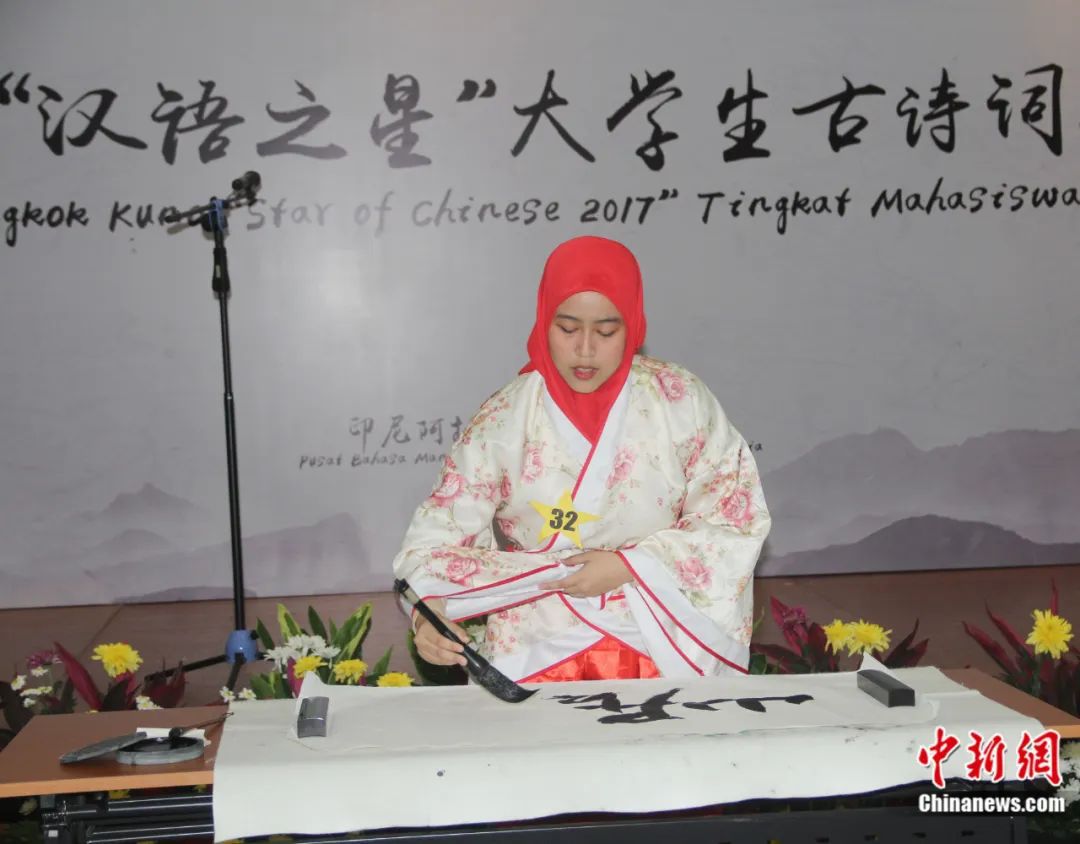 由中國孔子學(xué)院總部/國家漢辦主辦、印尼阿拉扎大學(xué)孔子學(xué)院承辦的2017“漢語之星”大學(xué)生古詩詞大賽在雅加達舉行。圖為印尼選手表演中國書法。林永傳 攝