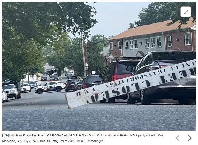 當(dāng)?shù)貢r間7月2日凌晨,美國馬里蘭州巴爾的摩的一場社區(qū)派對結(jié)束后,發(fā)生了大規(guī)模槍擊事件,造成2人死亡,28人受傷,其中包括14名未成年人。圖片來源:路透社報道截圖