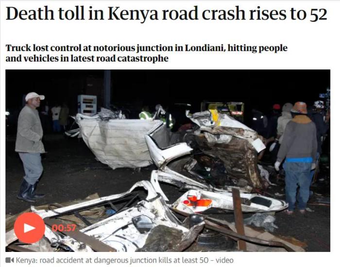 肯尼亞交通部長(zhǎng)穆爾科門在訪問(wèn)事故現(xiàn)場(chǎng)時(shí)表示,在發(fā)生這場(chǎng)“可怕”且“痛苦”的悲劇之后,將引入新的安全措施。他表示,“事故原因調(diào)查已經(jīng)展開,但我們敦促司機(jī)保持謹(jǐn)慎并遵守規(guī)則?!?/p>