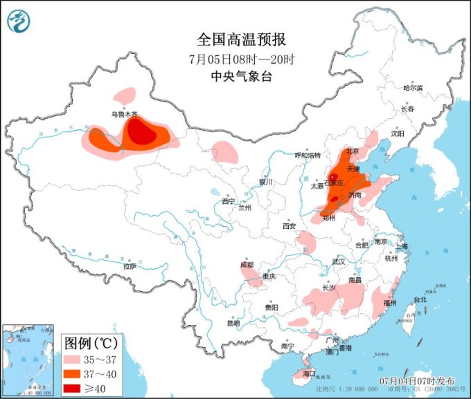 高溫方面,受降雨影響華北大部高溫天氣得到短暫緩解,明天起(5日)京津冀及黃淮等地高溫將再度發(fā)展加強,河北大部、北京、天津、山東北部、河南中北部等地日最高氣溫可達37~39℃,部分地區(qū)超過40℃。請公眾注意做好防曬降溫措施,盡量減少外出和戶外活動時間,及時補充水分,警惕高溫引發(fā)的中暑。