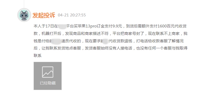 黑貓投訴平臺(tái)顯示,代收貨款相關(guān)投訴并不鮮見(jiàn)。有網(wǎng)友稱,在某電商平臺(tái)買蘋果手機(jī)支付訂金9.9元,到貨后額外支付1600元代收貨款,機(jī)器打開(kāi)后,發(fā)現(xiàn)商品和商家描述不符,電商平臺(tái)把商家封了,快遞平臺(tái)讓聯(lián)系發(fā)貨地點(diǎn)客服,可根本聯(lián)系不上商家。
