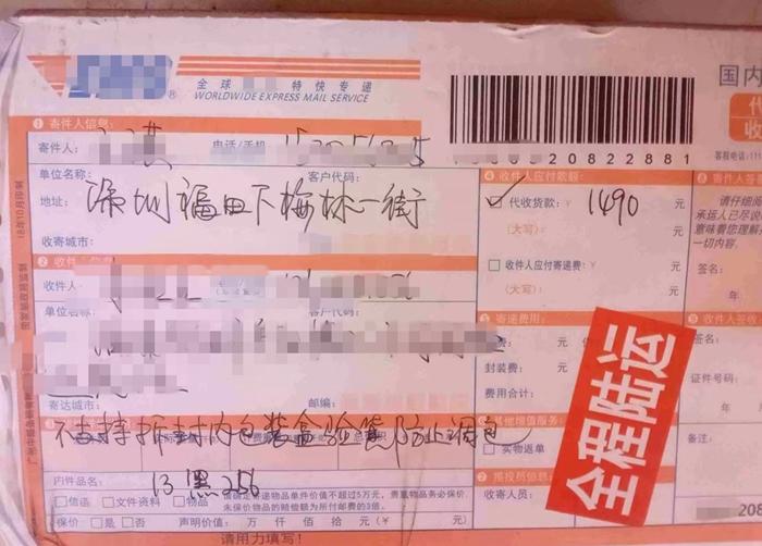 不過(guò)有消費(fèi)者反映,很多代收貨款快遞并不支持先驗(yàn)貨再簽收。記者在黑貓投訴上也發(fā)現(xiàn)部分快遞單標(biāo)注“不支持拆封內(nèi)包裝盒驗(yàn)貨防止掉包”。而這也在客觀上讓出現(xiàn)“代收貨款與貨物價(jià)格不符”的情況,成為可能。