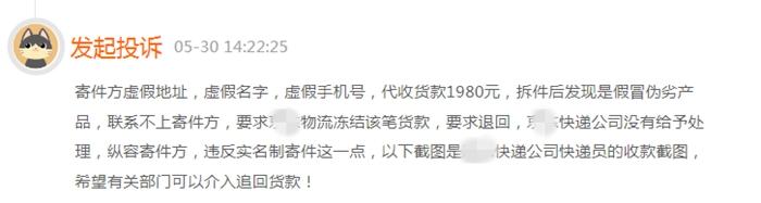 記者也注意到,在黑貓投訴平臺(tái)上就有消費(fèi)者投訴稱,“寄件方是虛假地址、虛假名字、虛假手機(jī)號(hào)”,快遞平臺(tái)代收貨款1980元,拆件后發(fā)現(xiàn)是假冒偽劣產(chǎn)品,聯(lián)系不上寄件方,要求快遞公司凍結(jié)該筆貨款并退回,快遞公司沒(méi)有給予處理。