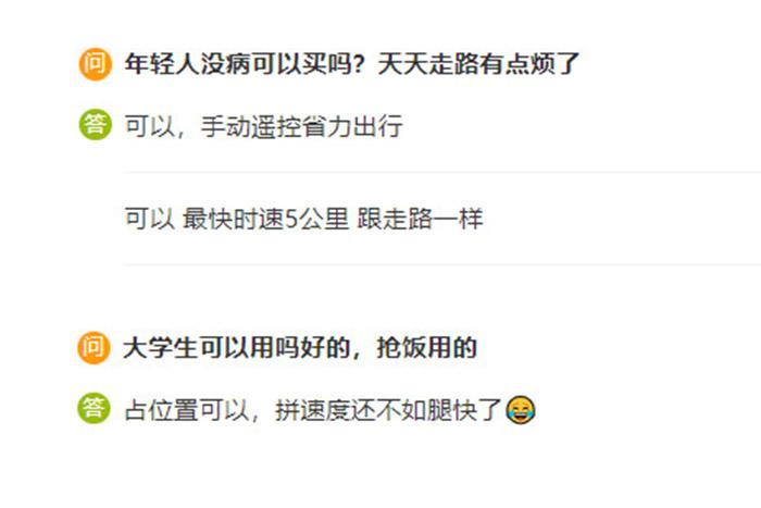 中新財經(jīng)注意到,在電商平臺上電動輪椅的問答區(qū),不少消費者都對電動輪椅展現(xiàn)出了濃厚的興趣,“年輕人沒病可以買嗎?天天走路有點煩了?!薄按髮W生可以用嗎?”“食堂搶飯用!神器?!薄澳贻p人也可以用,省力出行。”