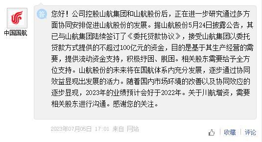 對(duì)于上述收購(gòu),中國(guó)國(guó)航于7月5日在投資者互動(dòng)平臺(tái)回應(yīng)稱,公司控股山航集團(tuán)和山航股份后,正在進(jìn)一步研究通過(guò)多方面協(xié)同安排促進(jìn)山航股份的發(fā)展。