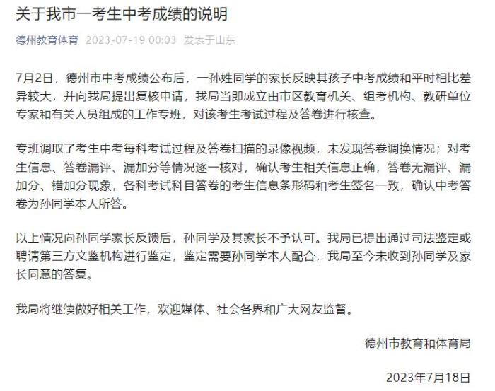 以上情況向?qū)O同學(xué)家長反饋后,孫同學(xué)及其家長不予認(rèn)可。德州市教育和體育局已提出通過司法鑒定或聘請第三方文鑒機(jī)構(gòu)進(jìn)行鑒定,鑒定需要孫同學(xué)本人配合,德州市教育和體育局至今未收到孫同學(xué)及家長同意的答復(fù)。