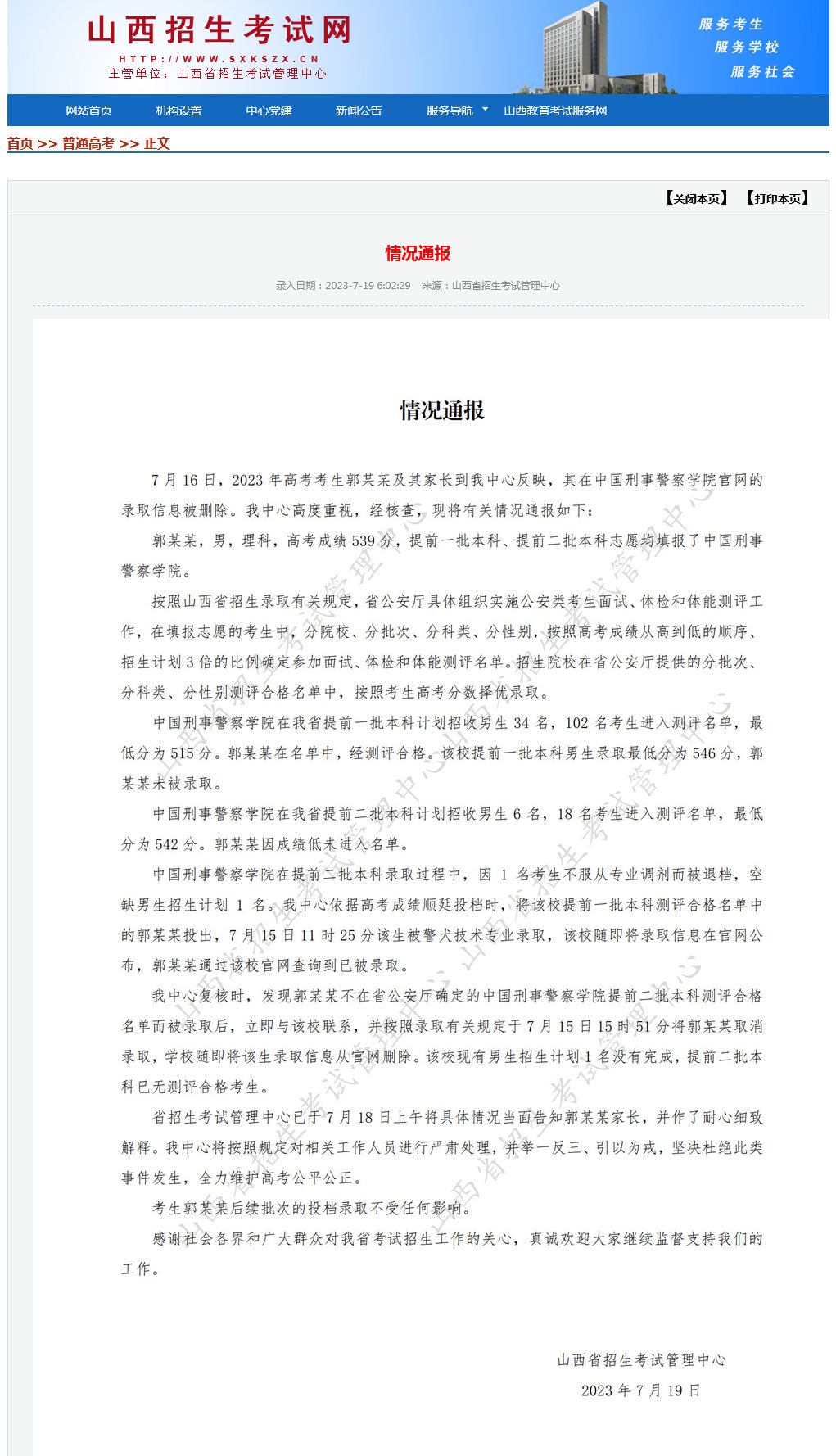 中新網7月19日電 據山西招生考試網消息,山西省招生考試管理中心19日發(fā)布情況通報稱,7月16日,2023年高考考生郭某某及其家長到該中心反映,其在中國刑事警察學院官網的錄取信息被刪除。該中心高度重視,經核查,有關情況如下: