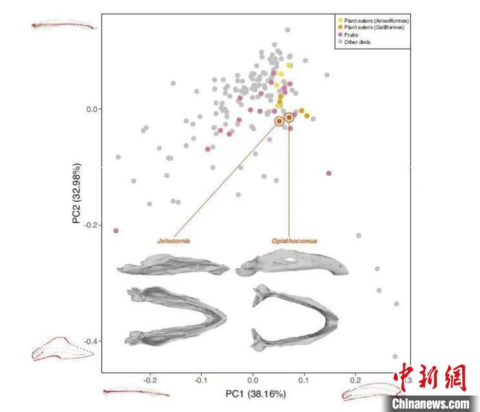 包括熱河鳥和現(xiàn)存鳥類在內(nèi)的三維下頜形狀PCA圖,重點(diǎn)與現(xiàn)存植食性鳥類對比。中國科學(xué)院古脊椎所 供圖