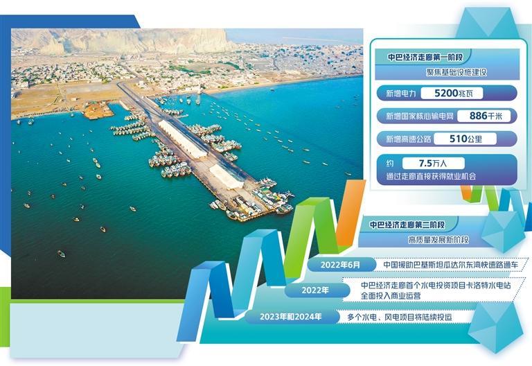 當(dāng)前正處于中巴經(jīng)濟(jì)走廊建設(shè)的第二階段,這也是至關(guān)重要的高質(zhì)量發(fā)展新階段。中巴雙方在走廊框架下,進(jìn)一步加強(qiáng)巴國工業(yè)化進(jìn)程、人力資源培訓(xùn)和產(chǎn)業(yè)園區(qū)建設(shè),在扶貧、醫(yī)療、農(nóng)業(yè)以及互聯(lián)網(wǎng)等眾多與民生息息相關(guān)的領(lǐng)域持續(xù)深化合作,力求創(chuàng)造更多就業(yè)機(jī)會,不斷推動巴基斯坦的經(jīng)濟(jì)和社會現(xiàn)代化發(fā)展,造福當(dāng)?shù)孛癖姟?022年6月,中國援助巴基斯坦瓜達(dá)爾東灣快速路通車,打通了瓜達(dá)爾港和卡拉奇之間的交通運(yùn)輸通道。同年,中巴經(jīng)濟(jì)走廊首個水電投資項(xiàng)目——卡洛特水電站全面投入商業(yè)運(yùn)營,每年將向巴基斯坦提供32億千瓦時廉價清潔電能,滿足當(dāng)?shù)?00萬人用電需求,每年可節(jié)約標(biāo)準(zhǔn)煤約140萬噸,減少二氧化碳排放350萬噸。今明兩年,走廊框架下的多個水電、風(fēng)電項(xiàng)目將陸續(xù)投運(yùn),未來巴基斯坦在清潔能源領(lǐng)域大有可為。