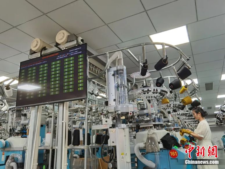 以縫頭為例,在一體化襪機(jī)之前,傳統(tǒng)的手工縫頭需要人工操作,效率很低,更新為襪機(jī)后,成本降低了至少一半。而智能系統(tǒng)端,機(jī)器的效率則被更加量化地體現(xiàn)在大屏幕上,一目了然,哪臺(tái)襪機(jī)出現(xiàn)問題,車間數(shù)據(jù)顯示屏就能看到,避免生產(chǎn)出次品襪子造成浪費(fèi)。