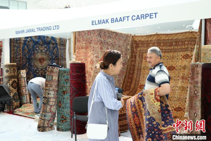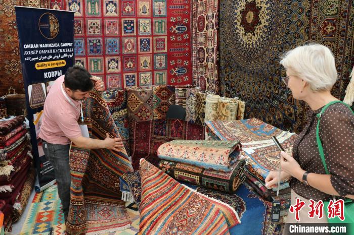 當(dāng)?shù)貢r(shí)間8月3日,哈薩克斯坦阿斯塔納,阿富汗商品展當(dāng)日啟幕。圖為展商向哈顧客展示阿富汗手工羊毛地毯。 中新網(wǎng)記者 張碩 攝