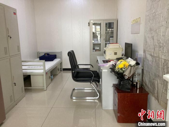 2023年8月,馮振在西小營小型站工作和生活的站長室,墻上貼著馮振和隊(duì)員一起繪制的地圖?!≈行律缬浾?徐婧 攝