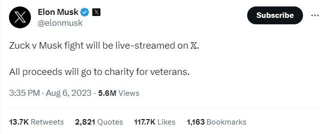 當日晚些時候,扎克伯格在自家的社交平臺“Threads”上回應,“我已經做好了準備”,并說:“我們不應該使用一個能真正籌措慈善資金的更可靠平臺嗎?”