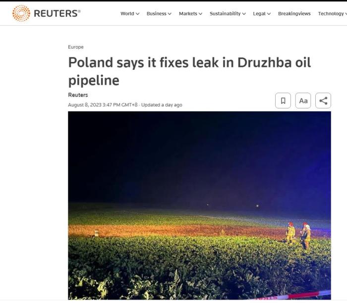 德魯日巴輸油管道發(fā)生泄漏 波蘭運(yùn)營(yíng)商稱已修復(fù)破損