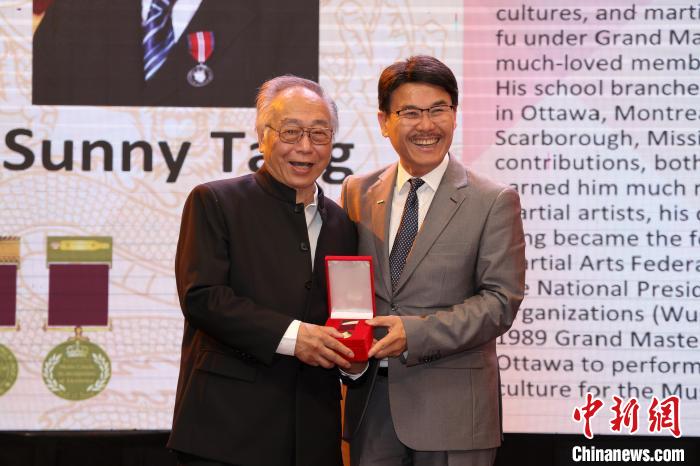 7日,國際武術(shù)聯(lián)合會(huì)執(zhí)行委員、加拿大武術(shù)團(tuán)體聯(lián)合總會(huì)會(huì)長鄧華(左)獲頒國際武術(shù)功夫名人堂勛章。中新社記者 余瑞冬 攝