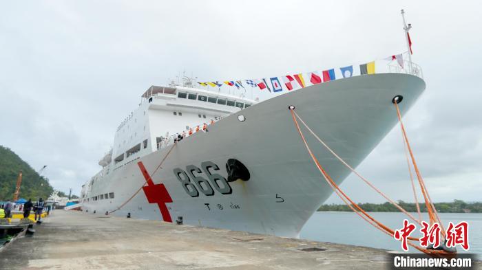 中新社維拉港8月8日電 (徐巍 劉博 李珂嘉賀)當?shù)貢r間8日上午,執(zhí)行“和諧使命—2023”任務的中國海軍“和平方舟”號醫(yī)院船抵達任務第三站瓦努阿圖維拉港,開始對瓦努阿圖進行為期7天的友好訪問并提供人道主義醫(yī)療服務。這是和平方舟第三次到訪瓦努阿圖。