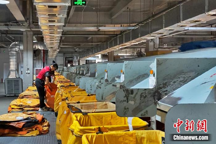 員工在圓通速遞分揀中心辛勤工作。中新財(cái)經(jīng) 葛成 攝