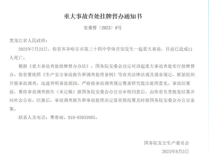 中新網(wǎng)8月14日電 據(jù)應(yīng)急管理部網(wǎng)站14日消息,國務(wù)院安委會發(fā)布重大事故查處掛牌督辦通知書。2023年7月23日,黑龍江省齊齊哈爾市第三十四中學(xué)體育館發(fā)生一起重大事故,目前已造成11人死亡。根據(jù)《重大事故查處掛牌督辦辦法》,國務(wù)院安委會決定對該起重大事故查處實行掛牌督辦。