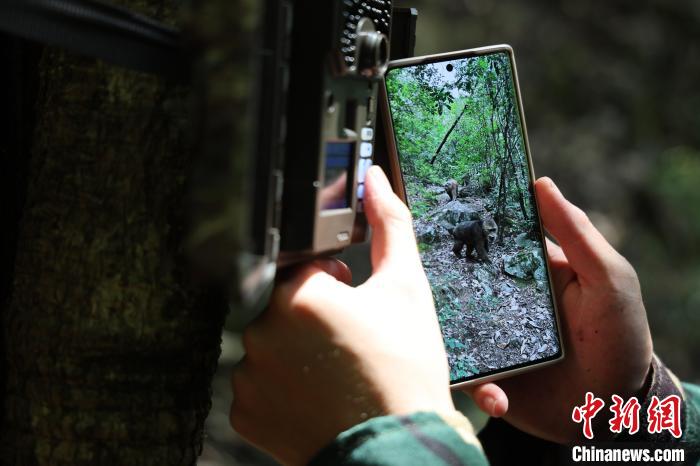 安徽大學研究團隊在安徽省黃山市湯口鎮(zhèn)浮溪村——黃山野生猴谷檢查監(jiān)控視頻。樊成柱 攝