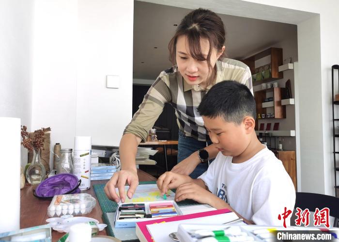 8月8日,吳婷婷在指導(dǎo)小朋友畫畫。 中新社記者 向一鵬 攝