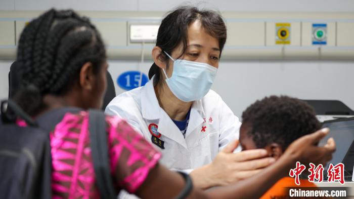 8月11日,中國(guó)海軍“和平方舟”號(hào)醫(yī)院船兒科醫(yī)生周霖在為一名患有腫瘤疾病的瓦努阿圖兒童做檢查。徐巍 攝