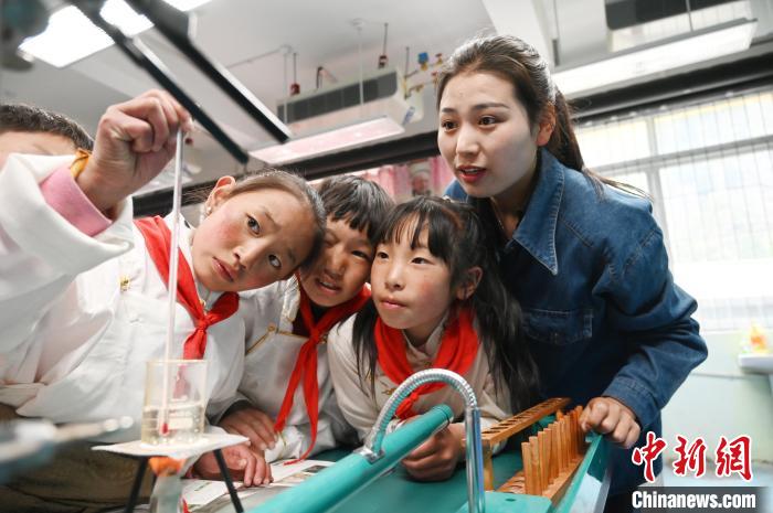 5月18日,四川阿壩州壤塘縣寄宿制學(xué)校學(xué)生在科學(xué)課做實(shí)驗(yàn)?!≈行律缬浾?安源 攝