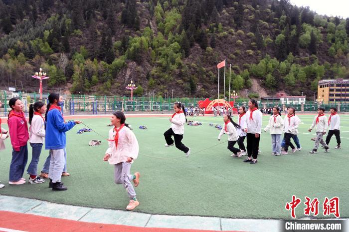 5月17日,四川阿壩州壤塘縣寄宿制學(xué)校的學(xué)生在操場(chǎng)跳繩?!≈行律缬浾?安源 攝