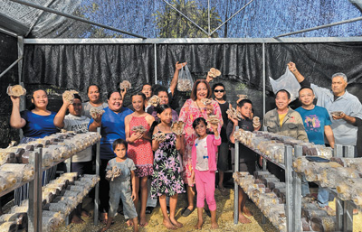 湯加示范戶阿拉尼一家在中國援助的食用菌大棚里采摘豐收的食用菌。