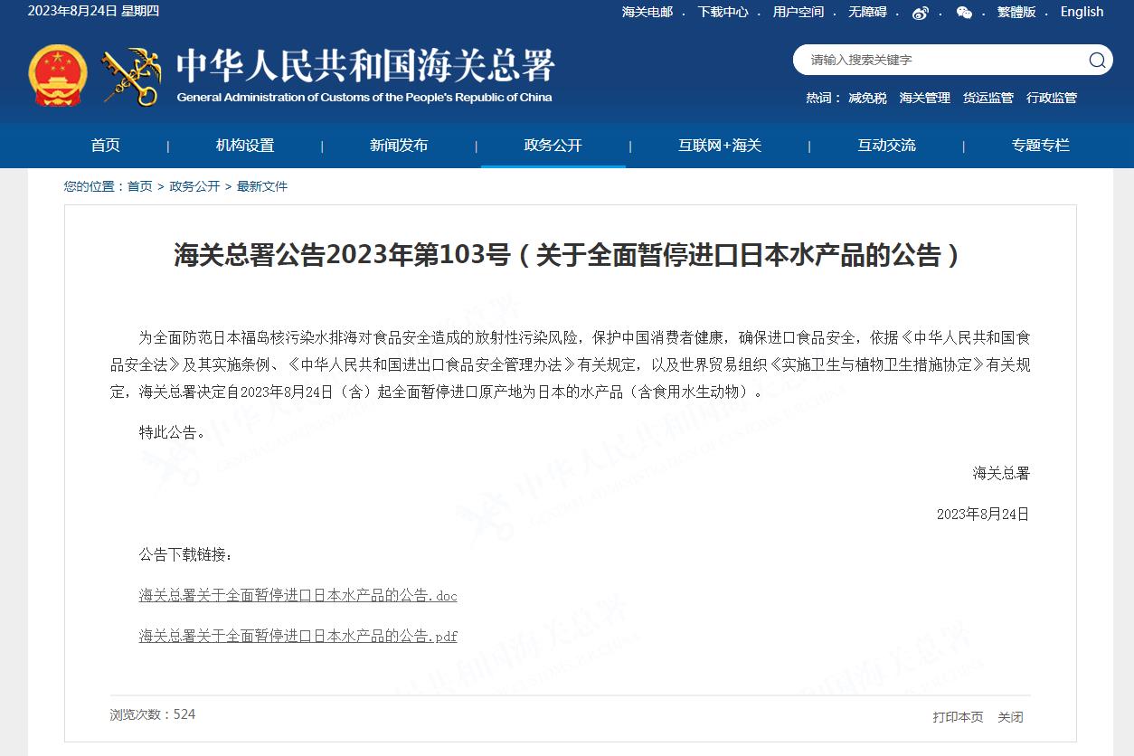 中新網(wǎng)8月24日電 據(jù)海關總署網(wǎng)站消息,為全面防范日本福島核污染水排海對食品安全造成的放射性污染風險,保護中國消費者健康,確保進口食品安全,依據(jù)《中華人民共和國食品安全法》及其實施條例、《中華人民共和國進出口食品安全管理辦法》有關規(guī)定,以及世界貿易組織《實施衛(wèi)生與植物衛(wèi)生措施協(xié)定》有關規(guī)定,海關總署決定自2023年8月24日(含)起全面暫停進口原產地為日本的水產品(含食用水生動物)。