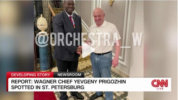 在圣彼得堡舉行的俄非峰會(huì)期間,“瓦格納”組織創(chuàng)始人普里戈任被拍到和與會(huì)非洲代表握手。(圖片來源:美國有線電視新聞網(wǎng)視頻截圖)