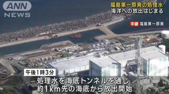當(dāng)?shù)貢r(shí)間24日下午1時(shí)許,日本將福島核污染水排入大海。圖片來(lái)源:日本朝日電視臺(tái)視頻截圖