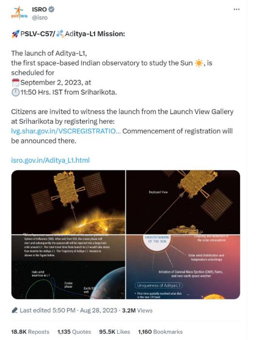 報(bào)道稱,作為印度首個(gè)專門研究太陽(yáng)的任務(wù),“太陽(yáng)神-L1號(hào)”(Aditya-L1)將成為印度空間研究組織新的里程碑。