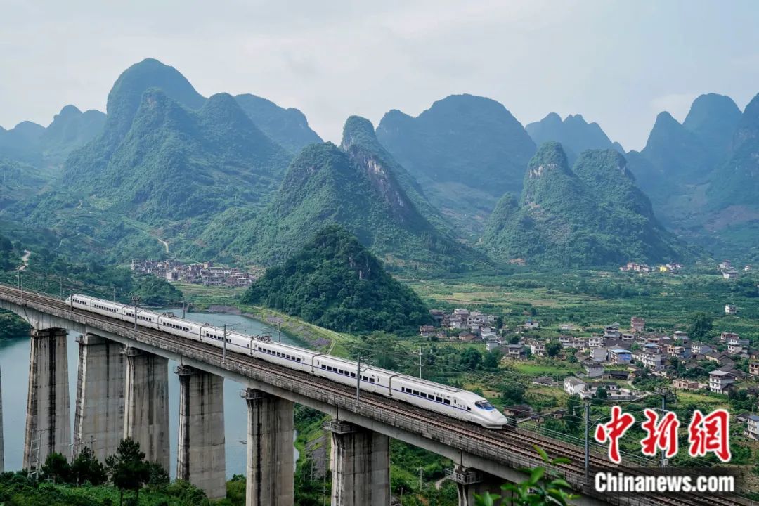 2019年5月,一列動(dòng)車穿越位于廣西陽朔縣興坪鎮(zhèn)內(nèi)的幸福源特大橋。陳冠言 攝