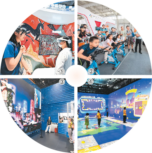 圖④:今年服貿(mào)會(huì)專題展聚焦行業(yè)熱點(diǎn)和發(fā)展趨勢,覆蓋AI和元宇宙技術(shù)、消費(fèi)電子服務(wù)等內(nèi)容。圖為服貿(mào)會(huì)首鋼園展區(qū),小觀眾在體驗(yàn)沉浸式游戲。